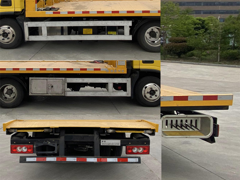 其它:該車主要用于道路清障,主要專用裝置為平板、絞盤、鋼絲繩、油缸。該車無托舉功能。側(cè)防護材料為鋁合金,螺栓連接;后防護材料為Q235,焊接,截面尺寸(mm):100x50,下緣離地高420mm。ABS型號/生產(chǎn)廠家:YF8/武漢元豐汽車電控系統(tǒng)有限公司,ABS-E/威伯科汽車控制系統(tǒng)(中國)有限公司,ABS-VI·E/廣州瑞立科密汽車電子股份有限公司,YF9/武漢元豐汽車電控系統(tǒng)有限公司。僅選用軸距3360mm。準乘人數(shù)/整備質(zhì)量對應(yīng)關(guān)系:2人/2865kg,3人/2800kg。選裝前圍。整備質(zhì)量包含冷卻液、潤滑劑、停車楔、反光背心、三角警告牌。