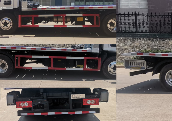 其它:該車(chē)主要用于道路清障,主要專(zhuān)用裝置為平板、絞盤(pán)、鋼絲繩、油缸.該車(chē)無(wú)托牽功能.側(cè)防護(hù)材料為Q235,螺栓連接;后防護(hù)材料為Q235,焊接連接;后防護(hù)截面尺寸(mm):100×50,下邊緣離地高420mm.ABS系統(tǒng)型號(hào):ABS-E;生產(chǎn)企業(yè):威伯科汽車(chē)控制系統(tǒng)(中國(guó))有限公司.ABS系統(tǒng)型號(hào):ABS-VI.E;生產(chǎn)企業(yè):廣州瑞立科密汽車(chē)電子股份有限公司.該車(chē)整備質(zhì)量對(duì)應(yīng)的配件包括隨車(chē)工具、三角墊木,不含備胎和滅火器.僅采用底盤(pán)3360mm和3600mm軸距改裝.