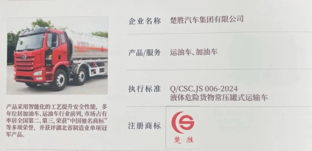 2025年4月9日,湖北省“湖北精品”認定榜單正式發(fā)布!楚勝汽車集團自主研發(fā)的加油車、運油車系列產(chǎn)品,歷經(jīng)技術先進性、質(zhì)量穩(wěn)定性、市場認可度、品牌影響力四重嚴苛考核,從全省制造業(yè)優(yōu)品中脫穎而出,成功獲此省級質(zhì)量標桿認證!這一榮譽不僅彰顯了楚勝在專用車領域的技術制高點地位,更以權威背書印證了“中國質(zhì)造”的硬核實力!