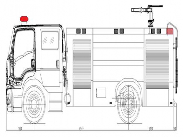 7噸消防車采用慶鈴汽車股份有限公司QL1180EQFRY 型二類汽車底盤,改制雙排駕駛室,乘員2+3人,該車駕乘舒適輕便。上裝采用內(nèi)藏式水罐,整車載液量水為4650kg,泡沫為1950kg。器材箱采用高質(zhì)量鋁合金卷簾門。底盤取力,發(fā)動機型號為6HK1-TCG61,最大功率177kW,通過萬向聯(lián)軸器驅(qū)動安裝在汽車尾部泵房里的上海雄真CB10/60型常壓消防泵,可在1.0MPa下穩(wěn)定輸出60L/s的流量;車頂安裝成都威斯特消防器材有限責任公司生產(chǎn)的PL8/48型消防炮(泡沫消防車),流量48L/s,對應壓力0.8MPa,最大承壓1.3MPa,射程 水≥70m 泡沫≥60m,可360°旋轉(zhuǎn)。同時該車具有比功率大、綜合性能強、操控集中簡便等特點。